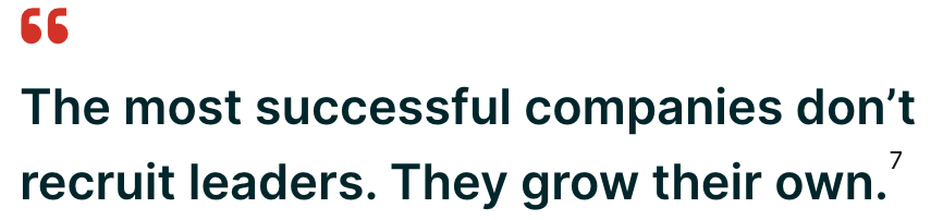 The impact that managers have on employees’, and thus the company’s, performance can’t be overstated. In fact, Gallup found that 70% of the variance in a team’s engagement is due to the quality of their manager.15 However, not all managers have strong, inherent leadership skills, or have been given training to develop these. When you take into account the effect of managers on workforce performance, it makes sense to overinvest in their development — and even more so when you consider that managers offer a pool of potential executive talent by virtue of already being in a leadership position.