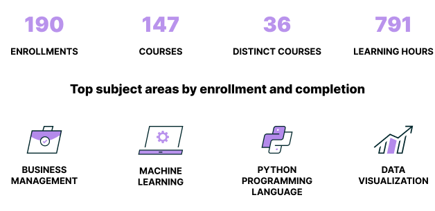 Within a month of purchasing 100 subscription licenses, the utilization rate reached 100% with its intended users. Of the 190 enrollments, 147 courses were completed by learners. University administration concluded that the AI-powered hybrid learning model not only met the immediate needs of students and faculty but also aligned with the university’s long-term objectives of innovation and global engagement.